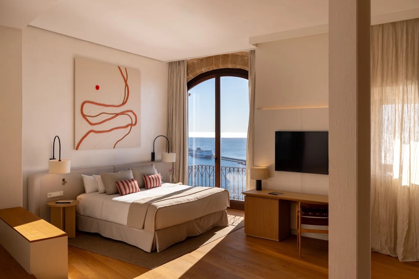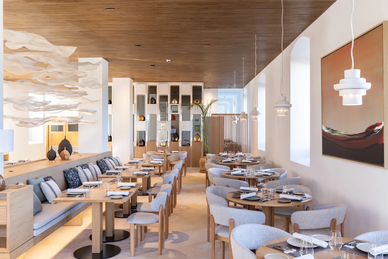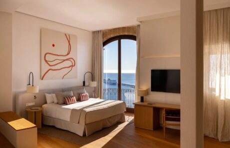 Supratex participó en el equipamiento y la decoración del proyecto con una selección de elementos que integran el textil en la identidad visual del espacio: cuadros decorativos, traseras de televisión tapizadas y mobiliario para el Espacio Gastronómico —el restaurante del Salón Almudaina y el salón de desayunos del Salón Sa Talaia—.